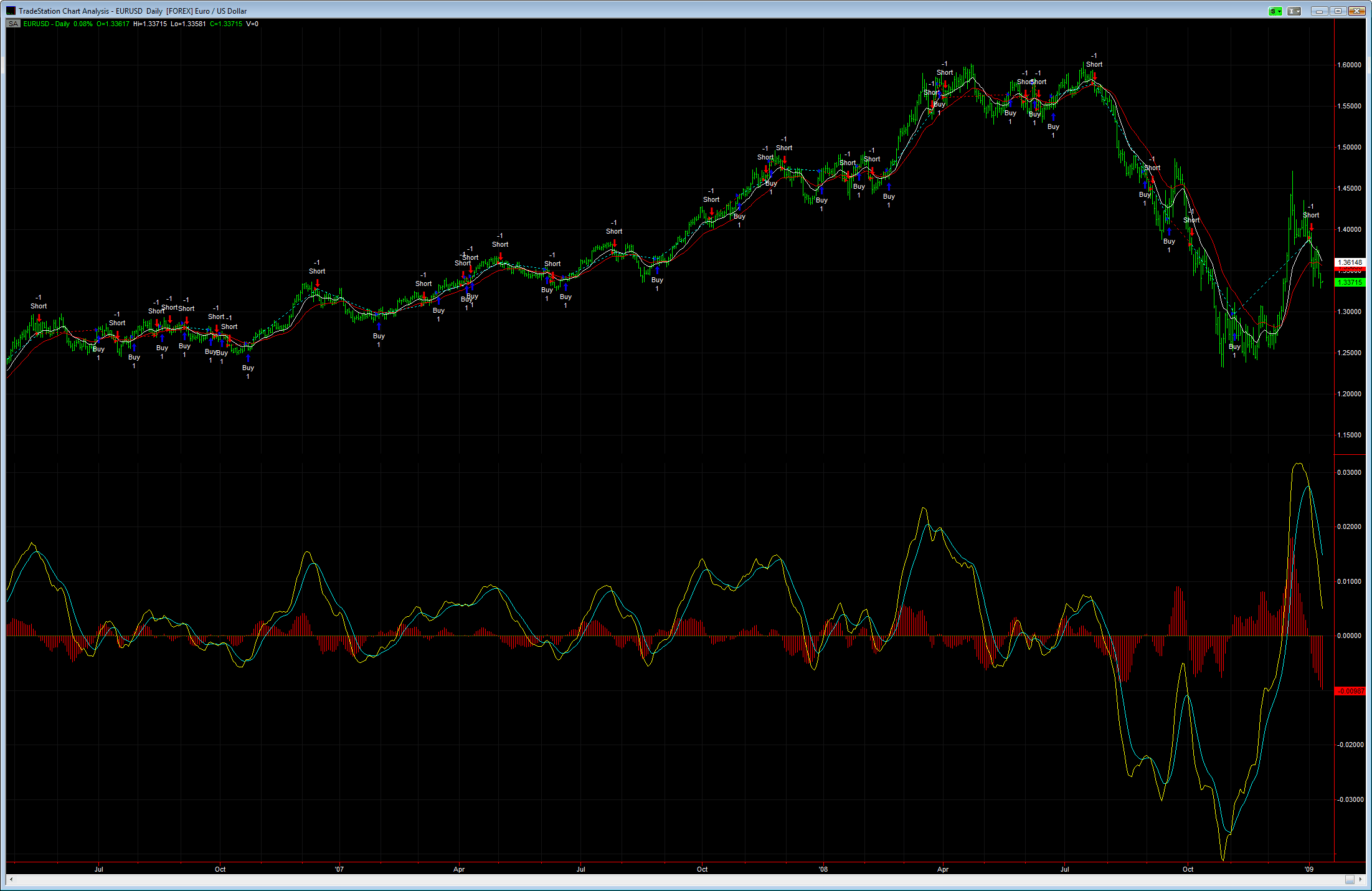 Charlie, ještě že tu máme Merkura, ušetřil mi hodně práce :-) Jenom bych rád upřesnil trochu terminologii, aby to bylo jasné. Indikátorem rozumím jakoukoliv techniku TA, která se vynáší do cenového grafu. Oscilátorem pak techniku TS, která osciluje kolem nějaké hodnoty, většinou nuly a je vynášena tudíž mimo cenový graf. Pokud bychom tedy chápali indikátory v terminologii Merkura, tak je to přesně jak popisuje, ukážeme si to na grafu níže - hodnota MACD (žlutý oscilátor) je rozdílem Fast EMA (12, bílý indikátor) a Slow EMA (26, červený indikátor). Je-li FastEMA nad SlowEMA, je žlutý MACD > 0 a naopak, lze tedy signál pro strategii vyrobit jak z křížení těch EMA tak protunutí MACD oscilátoru nulou. Udělal jsem i jednoduchou SAR strategii, abyste viděli vstupy a výstupy na základě takto definovaného signálu. Je třeba si uvědomit zejm. to že křížení EMAs je spojeno téměř vždy s velkými bary a tudíž cena signálu bývá o dost vyšší než by člověk chtěl. Pokud však na signál nepočkáte, může vám selhat a pak je třeba mít jinak definované podmínky pro SL než reversní signál. Modrý oscilátor je pak jenom dalším zprůměrováním žlutého MACD v našem případě 9 barů nazpátek jakožto EMA (stejným algoritmem jako bílá a červená EMA). Smyslem oscilátoru je vyhladit MACD a podchytit tak větší pohyby a oflitrovat "šum". No a nakonec jsou tu histogramy, které ukazují jednoduše rozdíl mezi MACD a vyhlazeného MACD - no a tento rozdíl sám o sobě může být vnímán jako zdroj signálu - obvykle tak, že pokud žlutá MACD překříží modrou MACD nahoru, je to buy signál a naopak. Na druhém grafu jsou pak vidět signály této volby strategie. Tato strategie má obvykle více obchodů, zejm. v období, kdy trh netrenduje. Tolik ke konstrukci MACD a ukázce na grafu. Teď k odpovědím na otázky, přestože už Merkur pěkně odpověděl: ad 1) a 2) Viz graf 1, tam jsou přímo ty signály vidět, pokud myslíte linkami EMY (indikátory). pokud bude strategie vytvořená čistě na základě signálu k nákupu/prodeji a nebude mít jinak definované výstupy, bude na 99% dlouhodobě v reálu ztrátová. Stejně tak strategie vytvořená podle protnutí histogramů nulou. ad 3) nerozumím otázce, pokud protne Fast EMA Slow EMA směrem dolů, bude žlutý MACD oscilátor vždy pod modrým vyhlazeným MACD (linka 9?) a naopak. ad 5) vyhlazený MACD pod nulou ukazuje na možný down trend a naopak. Pokud jsme v sideways, může oscilovat vyhl. MACD blízko nule a pak se dostane breakem rychle do extrému. V trendu se pak zase může dostat do opačné pozice (v up trendu do mínusu apod.) a přesto cenu vede Slow EMA atd. Tady se nachází široké pole působnosti pro vytváření filtru pro vstupy/výstupy strategie. ad 6) linku 9 protíná pouze žlutý MACD oscilátor a rozhodně jsou situace, kdy se dají definovat pěkné signály pro vstup/ výstup z pozice. Tady bych se soustředil zejm. na divergence mezi cenovým grafem a oscilátory, sledování situací, kdy se MACD dostane nad modrý vyhl. MACD v přeprodané oblasti pro buy signály a naopak. Doporučuji ovšem testovat pomocí kódu, uvidíte sám, že ty nápady ač vlmi dobré, tak nejsou vůbec jednoznačné a všeobjímající. ad 7) 8) nevím o čem mluvíte :-) ad 9) pozor ano, ale.. MACD není ocilátor, který osciluje jako stochastika mezi nějakými definovatelnými oblastmi jako že +100 a víc je překoupeno apod. Platí, že čím větší volatilita a range trhu je, tím i větších hodnot MACD dosahuje. Ve velmi klidném trhu tak v grafu uvidíte jak vám MACD pěkně osciluje do plus a mínus a najednou přijde velký break a ona vám naprosto šíleně ustřelí do řádově jiných hodnot, takže opatrně brát do strategií nějaká přesně stanovená čísla. ad 10) Nebyl bych tak jednoznačný jako Merkur, myslím, že jsou situace, které obvykle vyústí ve větší pohyb, NEEXISTUJE však na žádném oscilátoru a tedy ani na MACD nějaká situace, která by větší pohyb na 100% predikovala. Proto asi i odpověď Merkura NE. Mezi takové situace bych řadil dlouhodobější divergence typu nižší low na cenovém grafu a zároveň vyšší low na MACD oscilátoru pro pohyb nahoru a naopak. Kdyžtak mohu ukázat pár příkladů.