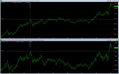 Dodal bych ještě k problematice dat a to zvláště historických tedy rok dva a více zpátky - dávejte si bacha na futures grafy. Díky samotné podstatě futures a rolování kontraktů se směrem do historie data obvykle přepočítávají tak, aby jednotlivé kontrakty v grafech na sebe navazovaly. Není úplně jednoduché si navíc ověřit integritu historických dat a co vím, tak málokterá demo platforma ale i "ostrá" platforma má data, na která se dá skutečně spolehnout. I proto si platím Tradestation, kde přestože nejsem s integritou 100% spokojen, tak mi to stále přijde jako špička. Mohu si nastavit jakým způsobem se data v grafu spočítají, stahuji si i data za jednotlivé kontrakty a tak mohu vidět skutečně reálný trh jaký byl v minulosti. Proč o tom píšu - problém je v tom, že si pracně třeba seženete data, uděláte si backtestym, papertradujete, vylezou vám velmi přesné výsledky backtestu, ale jak říká klasik, na velmi nepřesných datech :-) Výsledek pak může být velmi nepřesný a reálný výkon vám pak přivede akorát spoustu nepříjemných překvapení... Takže doporučuji si alespoň ověřit základní integritu a věrohodnost dat, např. tím, že se podíváte do minulosti na hodnoty, které vám grafy ukazují, dejme tomu nějaké předchozí all time highs nebo lows apod. a ověřit si je vůči datům, které poskytuje obvykle samotná burza. Jako příklad uvedu dva grafy, horní je tzv. průběžný kontrakt, kdy historické hodnoty jsou přepočítané na aktuální kontrakt (s tím se běžně setkáte), dolní jsou pak "čistá data", nepřepočítaná, tedy tak jak historicky byla. Svisle jsem vám ukázal referenční bar, odk terého vidíte sami, jak se data liší, stejně tak se budou lišit výsledky backtestu nebo papertradingu, protože některé vstupy třeba nebudou vůbec, některé obchody budete mít méně nebo více ziskové/ztrátové apod.