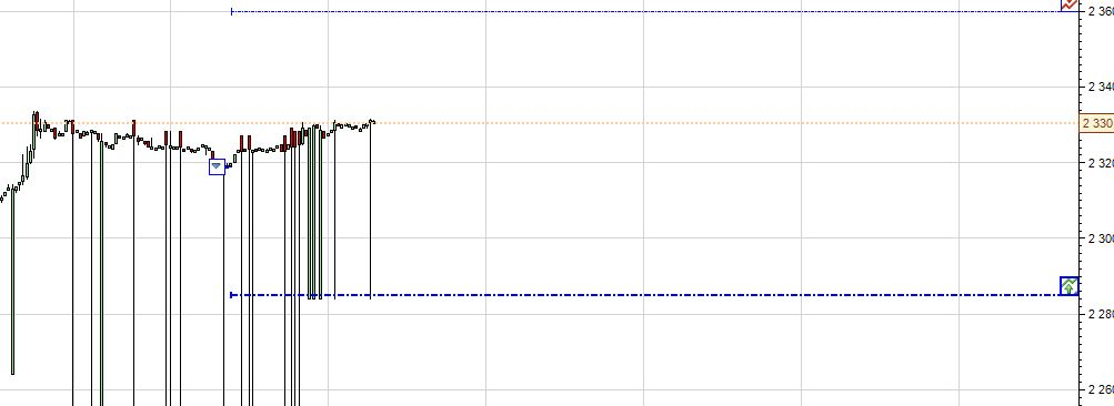 V trhu vám tedy čeká pouze nákupní příkaz na 123 bodech. Po jeho případném vykonání se do trhu zařadí kombinace OCO prodejních příkazů a to profit target na ceně o 6 bodů větší než je skutečná nákupní cena a stoploss na ceně o 3 body menší než je skutečná nákupní cena. Při prodeji na jednom příkazu se potom druhý automaticky stáhne z trhu.