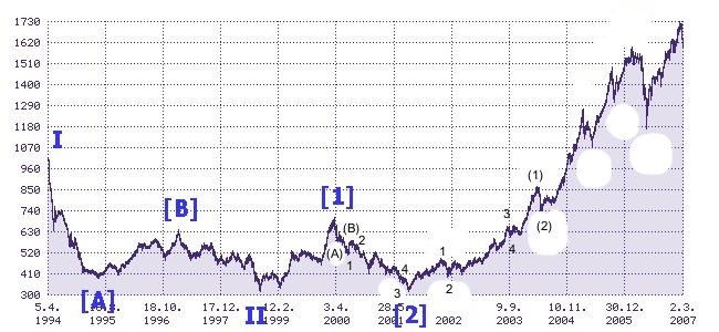 Abychom dosáhli transparentního výsledku musíme sladit nástroje a používat stejné moty. Trochu poodhalím roušku tajemství jak trhy fungují. Základní dosud nikde zveřejněný (MÜJ a světově unikátní???) postulát k EW teorii zní: [bold] Trh poroste tak dlouho, dokud poslední růstová vlna nebude překonána následnou rovnocennou poklesovou vlnou (vlnou stejné úrovně). Trh bude tak dlouho klesat, dokud poslední poklesová vlna nebude překonána následnou rovnocennou růstovou vlnou (vlnou stejné úrovně). [/bold] S tímto je možné si vystačit u každého trhu, v každém okamžiku, za každých okolností a bez rozdílu. S touto výzbrojí se vydám na zkoumání Petrova počítání vln. Zastavím se u korekce [1] [2] . Je to korekce cik-cak a její stěžejní body jsou (A) (B) [2] nahrazující konec (C).(dle obrázku). Nejvíc nás v tento okamžik zajímá vlna (B)[2], což je poslední poklesová vlna (impuls) s parametry 1234[2] a z ni nejvíce úsek vlny 4 [2]. Má li trh růst musí být dle mého postulátu tato vlna 4 [2] překonána.následnou vlnou s počátkem v [2] a koncem v bodě 1. Stejně tak u vlny (B)[2]. Tato vlna musí být překonána vlnou s počátkem v [2] a konce (1). Obojí se stalo a tak je bod (1) nezpochybnitelně určen. Vyznavači Rosse zde mají RH. (alespoň jsem to tak pochopil) Trochu naberu sil a budu pokračovat. rarit