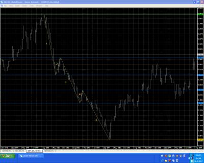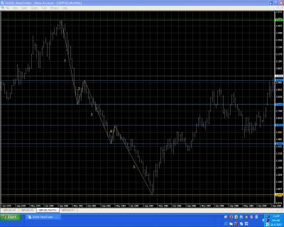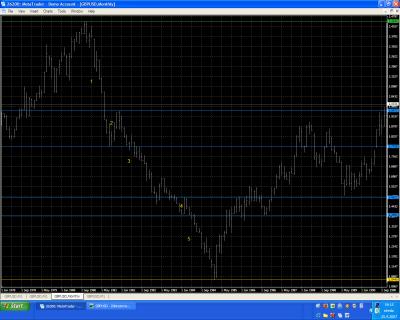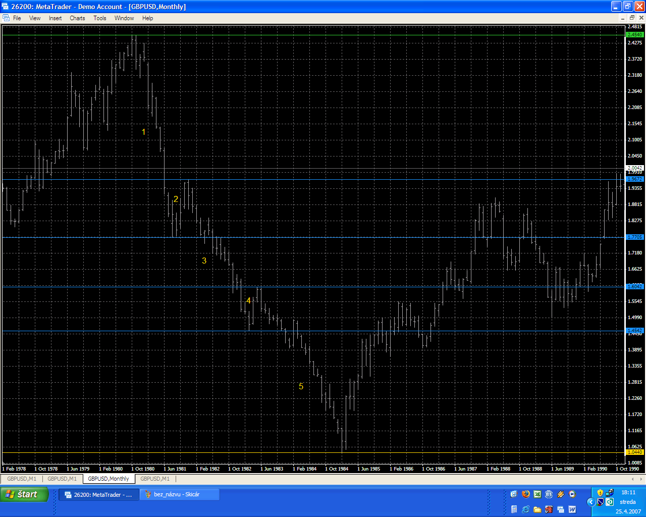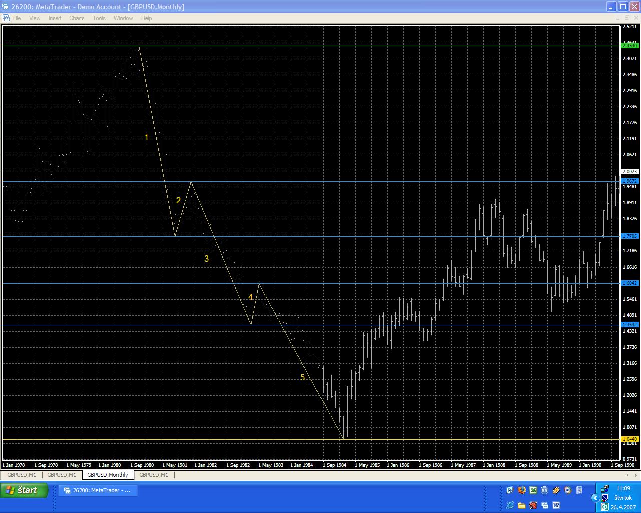 Zdravím, Po dvoch mesiacoch neúspešných pokusov vymyslieť nejaký systém založený na MA som to zatiaľ odložil na neurčito a vrhol sa na štúdium Elliotových vĺn. Teória je zaujímavá, manuál prečítaný, horšie to bude asi s praxou :-D. Venujem sa forexu a keďže posledné týždne iný menový pár ako GBP-USD ani neštudujem, skúsil som práve tu urobiť vlastnú analýzu EW. Podľa doporučení P.Obešla od najdlhších time frame a hneď v úvode si neviem rady. Na priloženom obrázku je mesačný graf GBP-USD od r.1978. Podľa mojich úvah som označil vlny 1-5 v pipsoch nasledovne, v zátvorke je dĺžka vĺn: 1. 24450 - 17705 /6745/ 2. 17705 - 19672 /1967/ 3. 19672 - 14542 /5130/ 4. 14542 - 16042 /1500/ 5. 16042 - 10440 /5602/ Podľa čísiel je hneď jasné, že niekde som urobil chybu, netuším však kde. „Vlna 3 nikdy není nejkratší ve srovnání s vlnami 1 a 5“ – píše sa v manuáli. Vlna 3 je však v tomto prípade najkratšia... V zálohe mám ešte jednu menej pravdepodobnú variantu, zmena nastala len u vĺn 3,4 a 5: 1. 24450 - 17705 /6745/ 2. 17705 - 19672 /1967/ 3. 19672 - 13963 /5709/ 4. 13963 - 14921 /958/ 5. 14921 - 10440 /4481/ V tomto prípade síce už nie je vlna 3 najkratšia, ale stále je kratšia ako vlna 1. Chcem teda poprosiť ako vidí uvedenú situáciu na grafe niekto skúsenejší v EW ako ja.