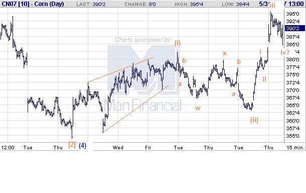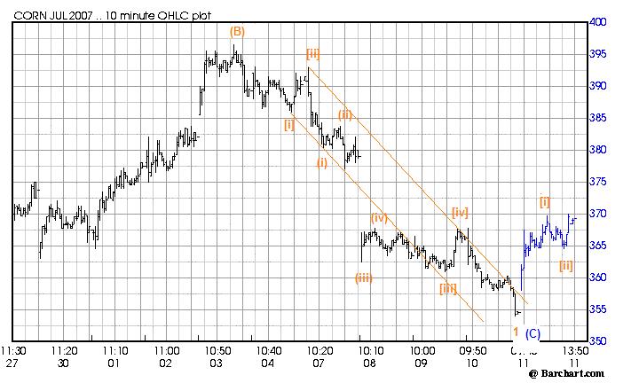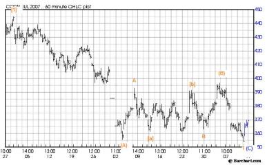 Rarite, oprava se samozřejmě přijímá. Poprosím ovšem o zdůvodnění. Klíč je zřejmě u vrcholu 4 - dokončení vlny (v) a následně pokračování 5. Nejlépe na 15 min. grafu kde bude celá Vaše vlna zřejmě (v) od cca 396. Přikládám svůj názor na vývoj kolem Vašeho vrcholu 4 = můj (C)/1. Myslím, že není podstatná absolutní úroveň počítání vln, ale relativní pro vzájemné porovnání stupně vln. Mějte se hezky. Jarda