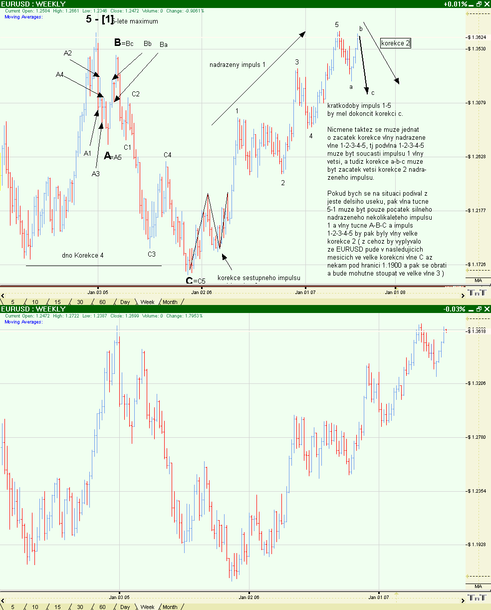 Zdravím příznivce EW! chtěl bych Vás všechny poprosit o shlédnutí vlnového počítání na EUR/USD 2005-2007 na týdením grafu. Kde jsem udělal chybu a co je správně ? Pokud bude mít někdo z Vás zájem mi pomoci, pak po korekci tohoto grafu přiložím podrobnější grafy denní / hodinové na tomto páru. Můžeme se tu tak společně pokusit o co nejpřesnější analýzu tohoto trhu z let 2005-2007. Předem velmi děkuji za pomoc & tipy! l. PS: Pod grafem s mým počítáním je stejný graf prázdný. Prosím naznačte své vlnové počítání do něj a přiložte ho do přílohy. Díky.