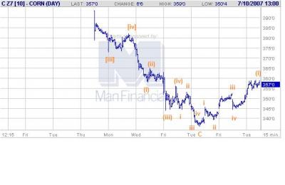 Již v minulosti jsem psal, že se mi skoro nikdy nezdaří "trefit" impuls. Stačí pár gapů a limitních pohybů a jde celá EW do háje. S tím jsem se již dávno mířil a proto se spíš snažím o pohled na impuls tak "nějak" zvenku. Co trh udělat může, co naopak "nesmí" a co "musí.". Ten impuls v CZ07 se mi vskutku "opět" nezdařil, ALE, bylo překonáno předchozí HIGH na 430 a v tom případě "musí" jít již o dokončený impuls (očekával jsem taky ještě pátou vlnu). Přeznačil jsem si (iii) na [i], a,b na (a)(b) a víc se nemění. Naopak "nesmí" být překonána hranice 355. Nezvažuji varianty. Buď EW platí a pak není co zvažovat, nebo je to jen odhad a to by se mi nelíbilo. Osobně vsázím na to, že EW platí. On ten trh nemůže nekontrolovaně stoupat či padat. Zprávy FEDu, nebo fundamenty mají na průběh vliv jak na předloňský sníh. (Jsem zvědav co budu říkat až bude 355 překonáno.)