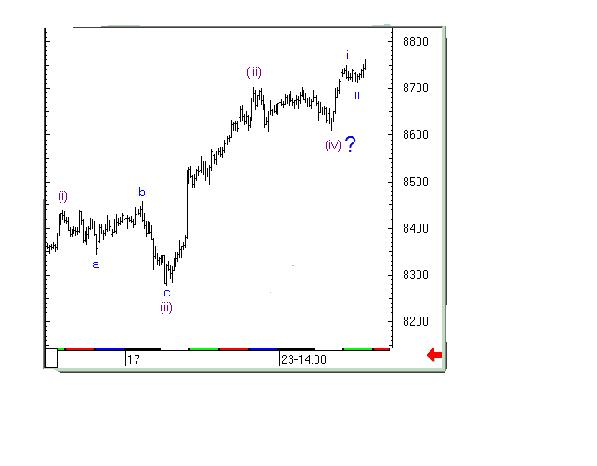 Tak OK. Takze tady je graf menoveho paru AUD/USD s komentarem,ze se jedna o rozvijejici se 5.vlnu s tim,ze pokud graf neklesne pod .8713, muze byt dosazena hranice .8876. Aktualne, kdy davam graf do diskuze, je hodnota kolem .8760 (ja jsem na teto hodnote 28 pipsu v plusu)