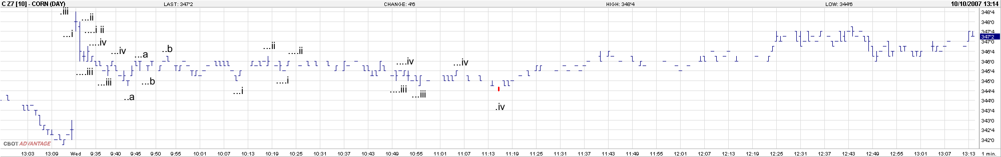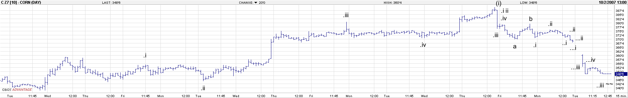 Jaroslave, Dnes jsem se rozhodl více sledovat CORN a počítat za běhu trhu a vcelku to šlo. To jen pro pochybovače o možnosti se dopočítat. Je tam červeně naznačena čírka která se měla utvořit ale zanikla a nastartovala následný růst. Není to nutně zasazeno do reálného rámce počítání. rarit