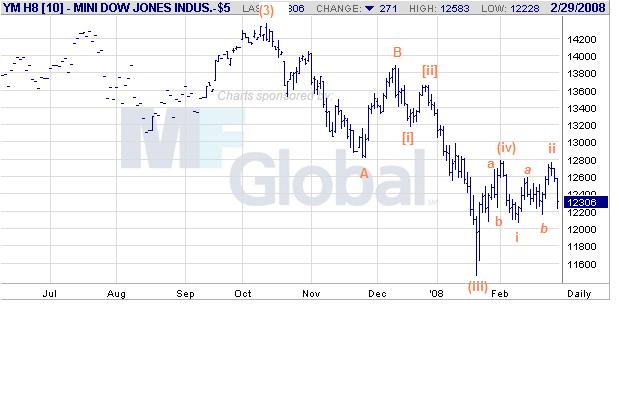 V praktickém znázornění v kukuřici se vrátíme ke dnu 12.02.2008 a předešlému zveřejněnému obrázku. Zde jsem udělal chybu v označení vrcholu. Označil jsem jej /iii/, což je zjevně špatně. Pokud by to měl být vrchol /iii/, musel by následný průběh být zcela odlišný. Pokud to není /iii/, nezbývá něž jediná možnost a to bod i. Toto podporuje i následný průběh. Pokud správně označíme korekci v korekci .a.b a hlavně poslední vlnu ..iii..iv máme vcelku vyhráno. Následná vlna úroveň ..iii..iv nepřekonala, čímž dostaneme vlnu …i …ii. Další průběh při dodržení bodu 4 zcela bez problémů již určíme. Další průběh je obdobný, kdy došlo k vytvoření ještě jedné vlny nižší úrovně. Konec na úrovni ….ii je pro pochopení zcela zásadní. Zde došlo k události jež v minulosti nenastala. Poslední vlka ……iii ……iv jež není na obrázku naznačena byla překonána vlnou …..i a trh byl naakumulován a mohl začít růst. Zde je třeba 1min grafu, kde je vše velmi zřetelné. Pokud budu mluvit o tom , že je to typické pro silně rostoucí trh, asi mi nebude věřeno. V každém případě kukuřice zcela určitě dosáhne v této fázi hodnoty kolem 600 a následně 700 rarit.