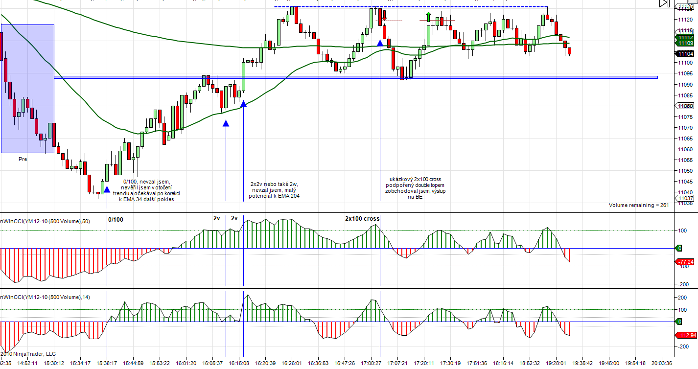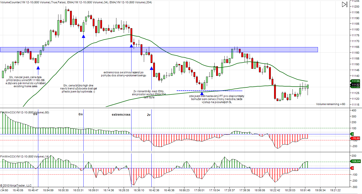 Archon: replay jedu jen od 15:30 do 18:00, tak aby to co nejvíc odpovídalo skutečnému obchodování. Jinak samozřejmě studuji i další pohyby, které třeba bývají později a hledám souvislosti. Pro mě je replay bezkonkurenčně nejlepší tréninková pomůcka i backtest jsem v něm jel. Jak jsem psal dříve, nezajímají mě vykreslené svíčky, ale to, jak tikají, jakou mají sílu atd., což bývá v backtestech opomíjeno. K vašemu grafu - 1.10. to byl náročný den na obchodování. V 15:55 tam byla nějaká zpráva, po které byl trh dost nervozní a nevěděl kam se vydat. V podstatě se během prvních dvou hodin trend pořádně nerozjel ani na jednu stranu. Já měl na svých grafech double bottom, pak double top, CCI 50 nebyla pořádně v extrému, až zhruba od 16:30 a když jsem po flipu vstoupil, byl z toho SL. Posílám dnešek na mých grafech. Vzal jsem 3 obchody, jednou SL, u zbylých dvou cena nedošla na můj PT (nad low dne) o dva ticky, takže výstup na posunutých SL. Celkově mírná ztráta, štěstí nebývá na mé straně, takže jsem si na těsné vyhození na SL nebo těsně nedosažené profit targety už zvyknul. :-)