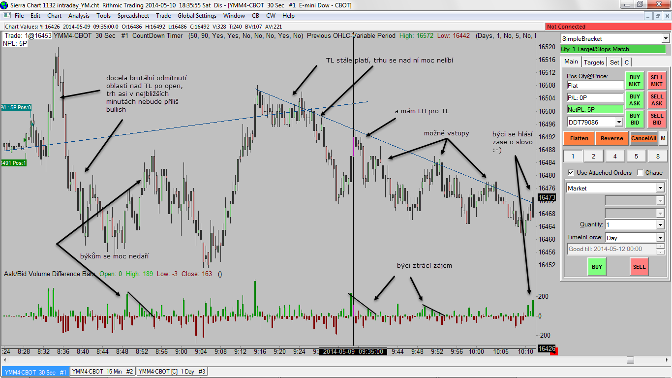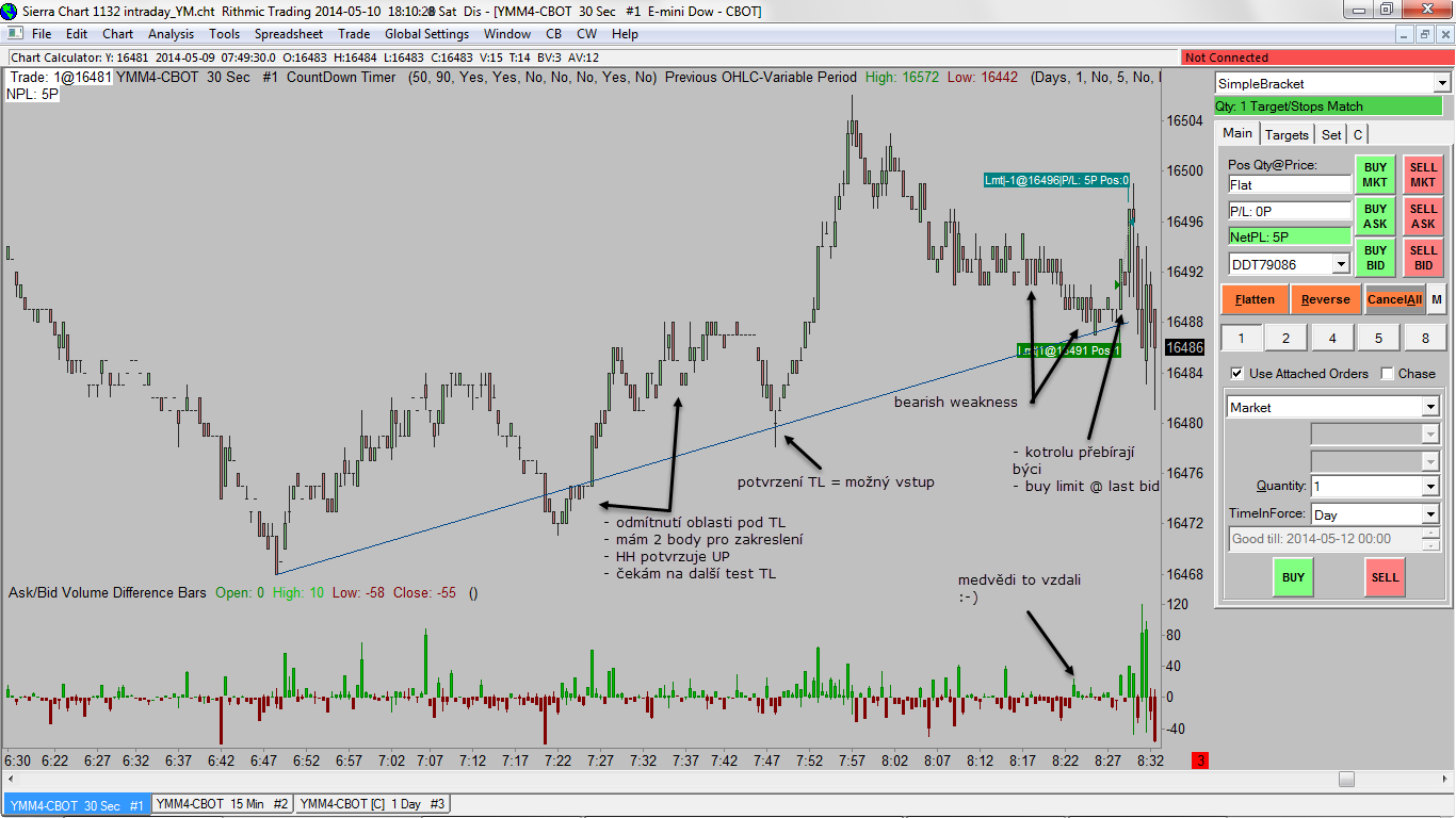 jedu právě YM, kreslím pouze trendové linky, levým okem sleduju Ask Bid deltu pod grafem