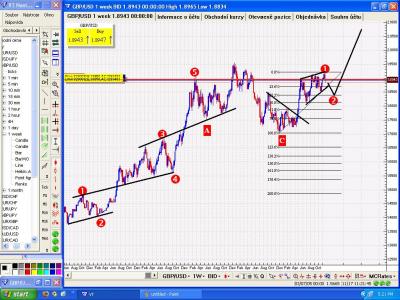 Zdravim... dnes som skusal si podrobne z analyzovat cable.. pouzil som metodu elliottovych vln,zobrazil weekly graf(obr 1), potom som si dal daily graf(obr 2) a potom 1H graf(obr 3).. OBR 1:od oktobra 2001 sa cable zmenil z bear na bull, a po vytvoreny impulsu(konci 5 vlnou), nasledovala korekcia A-B-C, ktora mala tvar "IRREGULAR FLAT", co znamena, ze vlna B presiahne vlnu 5, a C presiahne A vlnu... po skonceni C vlny ma nasledovat znova smer v smere trendua pocitanie zase od 1.. ako vidime vlna 1 vytvorila leading diagonal, ktoreho vnutorna struktura je tiez 5 vln(obr 2). po vlne 1 nasleduje vlna 2 ktora je korekcia k vlne 1, robi najcastejsie retracementr 38,2 %, co je priblizne na hodnote 1,8400.. takze ak bola moja analyza EW spravna, mal by sa trh pohnut aspon na uroven 1,8400 a potom sa otocit a ist bull. ak si pozriete obr 2 t.j daily graf vidime, na nom uz zmienovany leading diagonal, aj s 5 vlnovou struktorou.. vidime tam aj ze cable vytvoril komplet 1 vlnu, takze mala by nasledovat korektivna vlna 2 na uroven 1,8400.. pre pripad vegas daily sa nam moze javit prilezitost po vytvoreni 2 vlny, kde by mal trh dosiahnut fibo uroven a jeho otocenie. uvazoval by som aj nad moznostou vstupit short a PT nastavit na uroven1,8700... OBR 3: je 1H graf,ukazuje nam vyvijanie vlny 2. vieme ze kanal vo vegas 1H sa sprava ako pivot, bud ho prejde alebo sa odrazi.. odrazil sa... to je nasa zamienka pre vstup short a mozme ocakavat downtrend.. zadat SL na high predchadzajuceho candle. PT podla seba si urcit, bud kratky, ale aj velky, lebo potencial tam je.. tak to by bola moja analyza cable, nemozem povedat ze vsetko co som povedal je spravne, ale aj keby nebola moja analyza pomocou EW spravna, 1H vegas nam ukazuje signal na vstup short, po odraze od tunela. moja analyza ho len podporuje.. dufam ze som to napisal zrozumitelne:)) S pozdravom Zero999