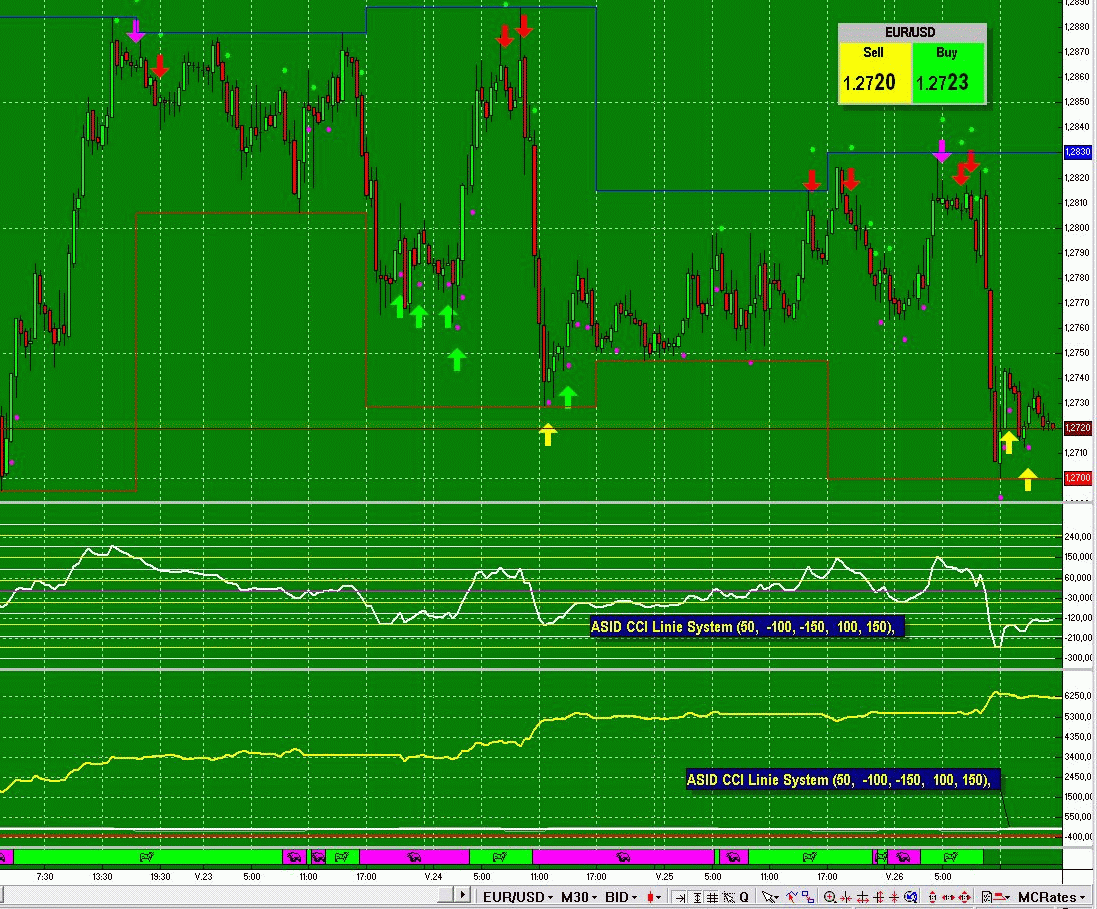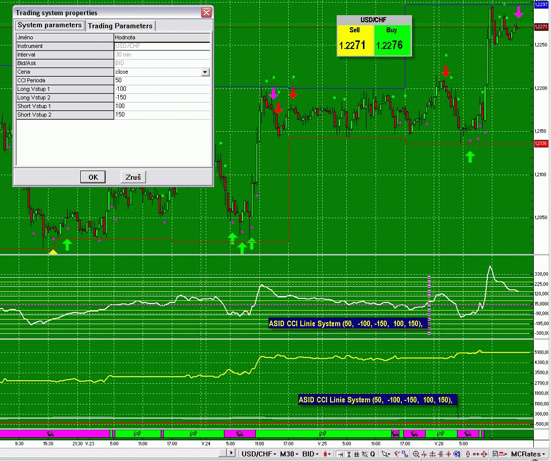 Jak tak sleduji diskuzi o Woodie CCI musím přidat taky svou trochu do mlýnice. Tuším, že Lisakus psal, že zkouší různá nastavení od 100/-100 až po nulu. Takto postupuje asi valná většina traderů. Je to zažitá formulka u více traderů, že klasicky CCI funguje tak (ne Woodie), že při přechodu nuly Up vstupujeme Long a pod nulou jdeme Short. Podle mne tak postupuje 90% traderů... ZÁSADNÍ CHYBA !!!..Trh je v tu dobu už někde úplně jinde...Tímto způsobem se nedá nikdy vydělat, je třeba téměř zásadně vstupovat pro Long, když je CCI křivka pod nulou a opačně pro Short (CCI je nad nulou). Abych jen nevedl teoretické úvahy, vytvořil jsem si tento týden AOS s posuvnými vstupy, dva pro každou pozici Long a Short. Každý vstup má i logický podmínkový výstup. Zkrátka trader si sám zvolí podle min. grafu a páru hodnoty od mínus 300 přes nulu po plus 300. Pro Long vstupy si zadám hranici např. -100 a -150 a pro Short 100 a 150 (měním to podle minutáže grafu a podle párů). Troufám si tvrdit, že tento CCI systém (postup) nemůže být téměř nikdy ztrátový....Zajímavá je kombinace, když si zadám např. pro Long jeden mínusový a jeden mírně plusový vstup - taky to dobře funguje....Systém je starý asi týden a dva kolegové ho jeli "naostro" tři dny. Jeden na minilotech s třemi hlavními páry pět hodin denně odpoledne (po 0,1 lotech) - zisk 900 dolarů, druhý jen na cable dopoledne od 8 do 12 (v zaměstnání..:-) ) s celým lotem - zisk 2500 dolarů...Takže něco na tom asi bude...Přikládám dva obrázky s USD/CHF a EUR/USD na 30 min.- perioda 50, ze kterých je trochu patrné jak to funguje...Pro kratší grafy se adekvátně i sníží rozsah plus/mínus hodnot a periody CCI..U Profit displey (nastaven je pro běžné loty), když nastane kratší rovná čárka, není otevřená žádná pozice..Což je taky výhoda tohoto systému, neotvírá otrocky Long-Short-Long-Short atd....ale zavře pozici a čeká na další šanci..Stop Lossy systém nepoužívá, protože to není vůbec zapotřebí - CCI je dostatečně volatilní. Takže tady mají příznivce CCI návod "jak na to" - vstupovat tak, jak bylo výše popsáno a určitě to bude mnohem, mnohem více profitní než veřejně zažitá a všude zmiňovaná formulka o CCI>0 Long a CCI1546