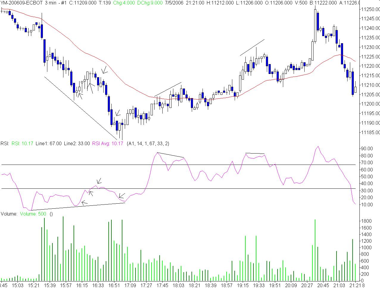 2 Petr uf, definice divergence: RSI divergence je, pokud trh vykazuje trendovy pohyb opačnym smerem nez indikator RSI. Osobne bych vam doporucil projit vsechny 4 kurzy co dela financnik protoze za trochu penez si usetrite spoustu casu a hledani jiz nalezenych cest. V priloze posilam praktickou ukazku divergenci ze vcerejsiho obchodovani YM na 3 minutovem grafu. Jsou tam zakresleny tri divergence pricemz ta hlavni (skutecna) divergence je ta velka prvni, dalsi dve mensi jsou tak zvane "korektivni" divergence - predznamenavaji korekci ale nikoliv otoceni trendu. Po prakticke strance to znamena ze se da obchodovat po i proti smeru trendu. Vzdy je jen nutne mit na pameti tyto skutecnosti: 1. trh prave ukazal silnou divergenci - nemusi to znamenat, ze se jedna opravdu o hlavni divergenci - muze se jednat o korektivni divergenci. 2. v tom pripade je lepsi obchodovat nasledné otočení a dostat se zase do trendu - tyto pohyby byvaji velmi vyzivne ;-) Jeste k priloze. ta hlavni divergence byla nejdrive korektivni - viz. prvni dve sipky kdy jsem nastoupil do obchodu a nasledne vystoupil, druhe dve sipky byl navrat do trendu ktery mi vcera prinesl nejvetsi zisk(na papire) - v 5 hod. jsem totiz sel hrat tenis ;-) a proto jsem to presne ukazane otoceni trentu uz neobchodoval....