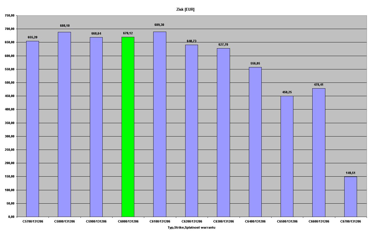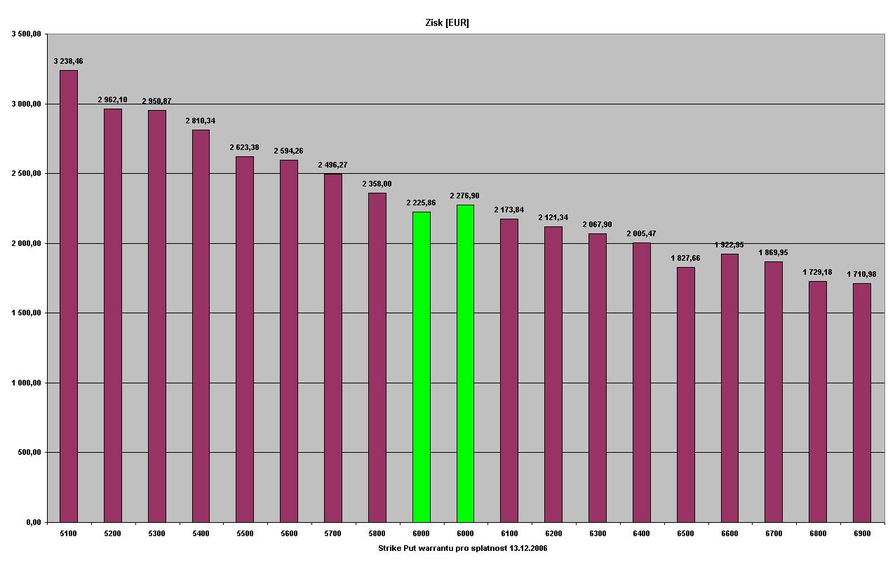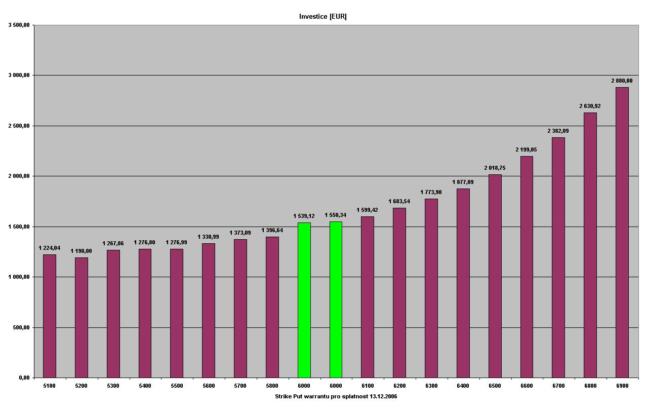 Pokračování č.1 červeně označené warranty jsou warranty, které bych osobně pro danou splatnost vybíral. Jedná se o warranty s hodnotou delta cca 0,4. Na grafech jsou tyto warranty označeny zelenou barvou. Konzervatinější obchodník může volit warranty s hodnotou delta 0,5. 1.graf zobrazuje objem investice do warrantu s daným strikem a splatností, aby byly dodrženy pravidla moneymanagementu. 2.graf zobrazuje zisk z dané pozice [bold] Warranty se splatností 13.12.2006[/bold]