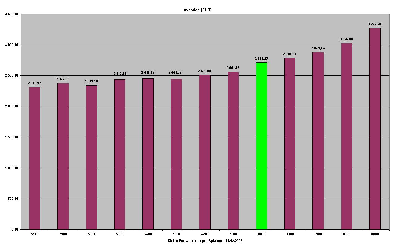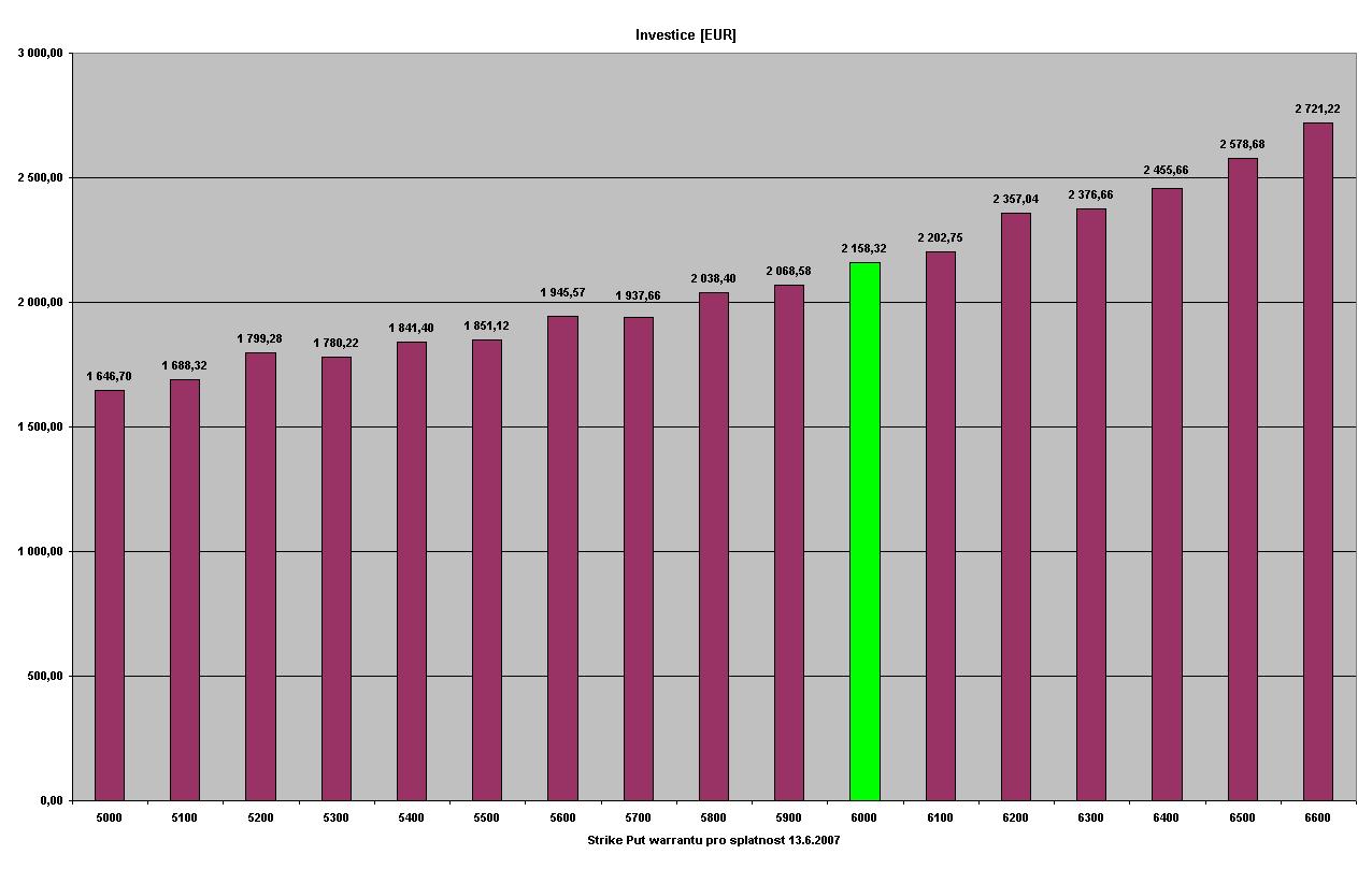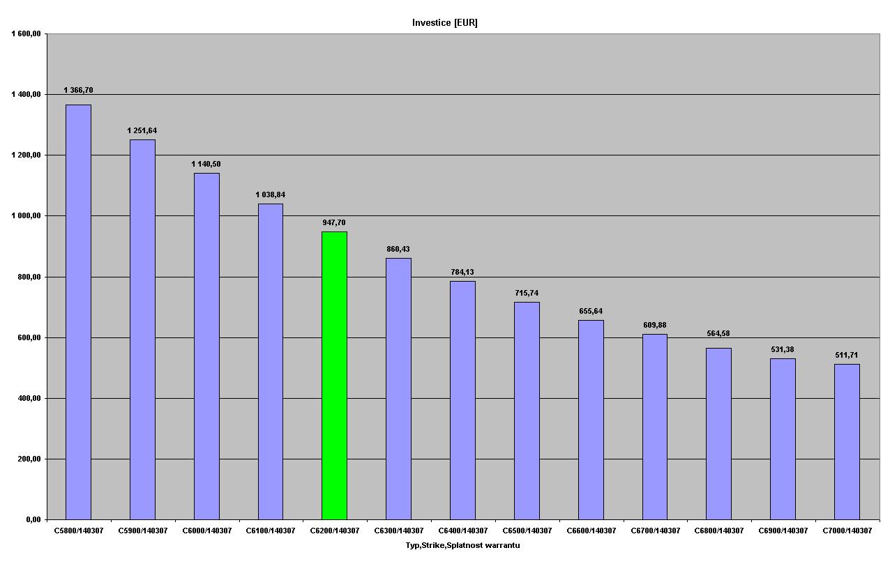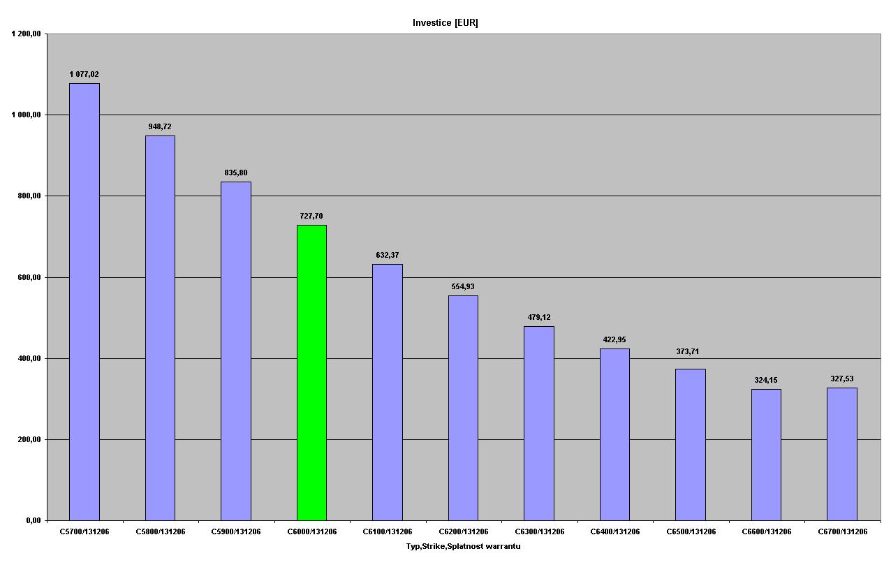Pokračování č.1 červeně označené warranty jsou warranty, které bych osobně pro danou splatnost vybíral. Jedná se o warranty s hodnotou delta cca 0,4. Na grafech jsou tyto warranty označeny zelenou barvou. Konzervatinější obchodník může volit warranty s hodnotou delta 0,5. 1.graf zobrazuje objem investice do warrantu s daným strikem a splatností, aby byly dodrženy pravidla moneymanagementu. 2.graf zobrazuje zisk z dané pozice [bold] Warranty se splatností 13.12.2006[/bold]