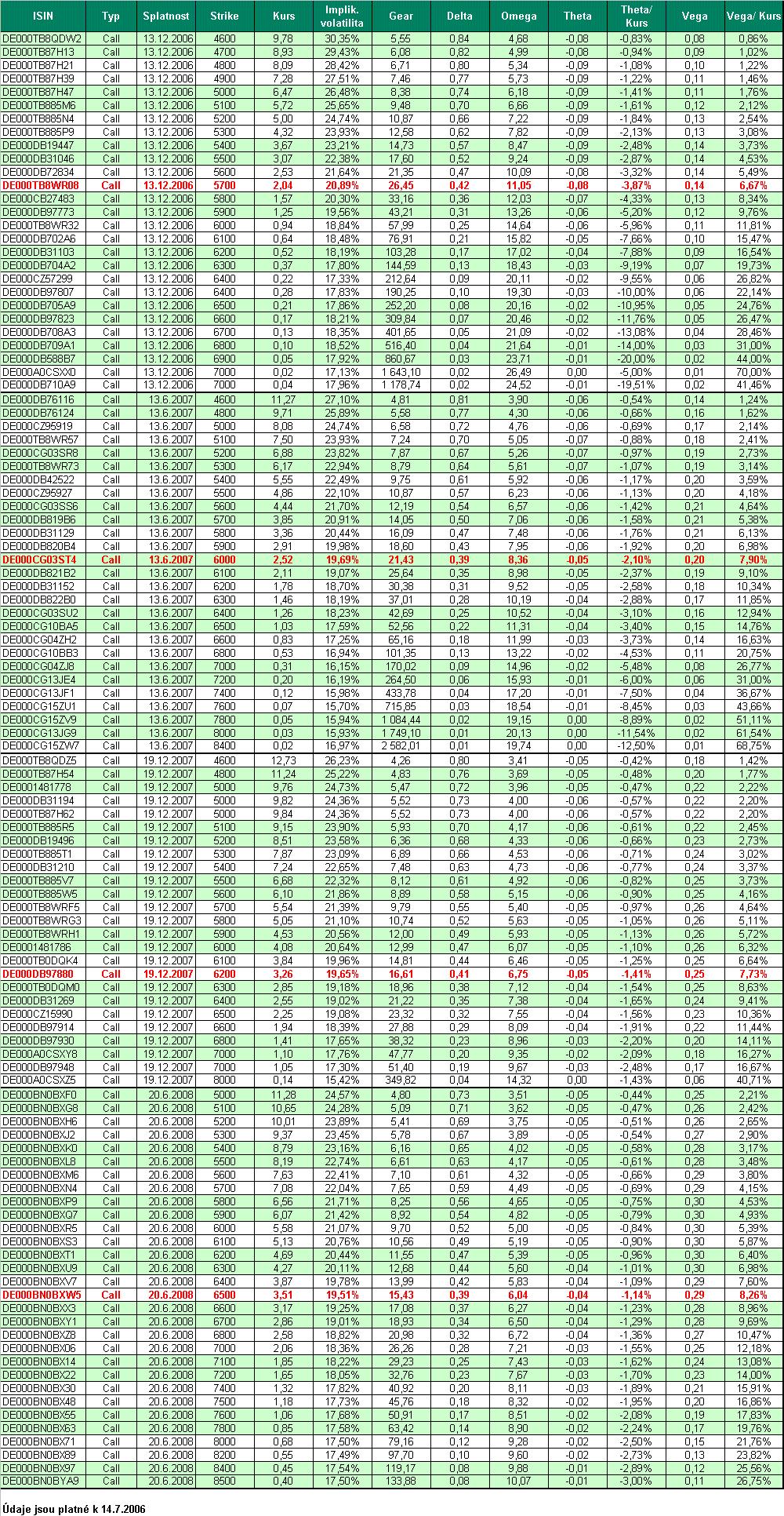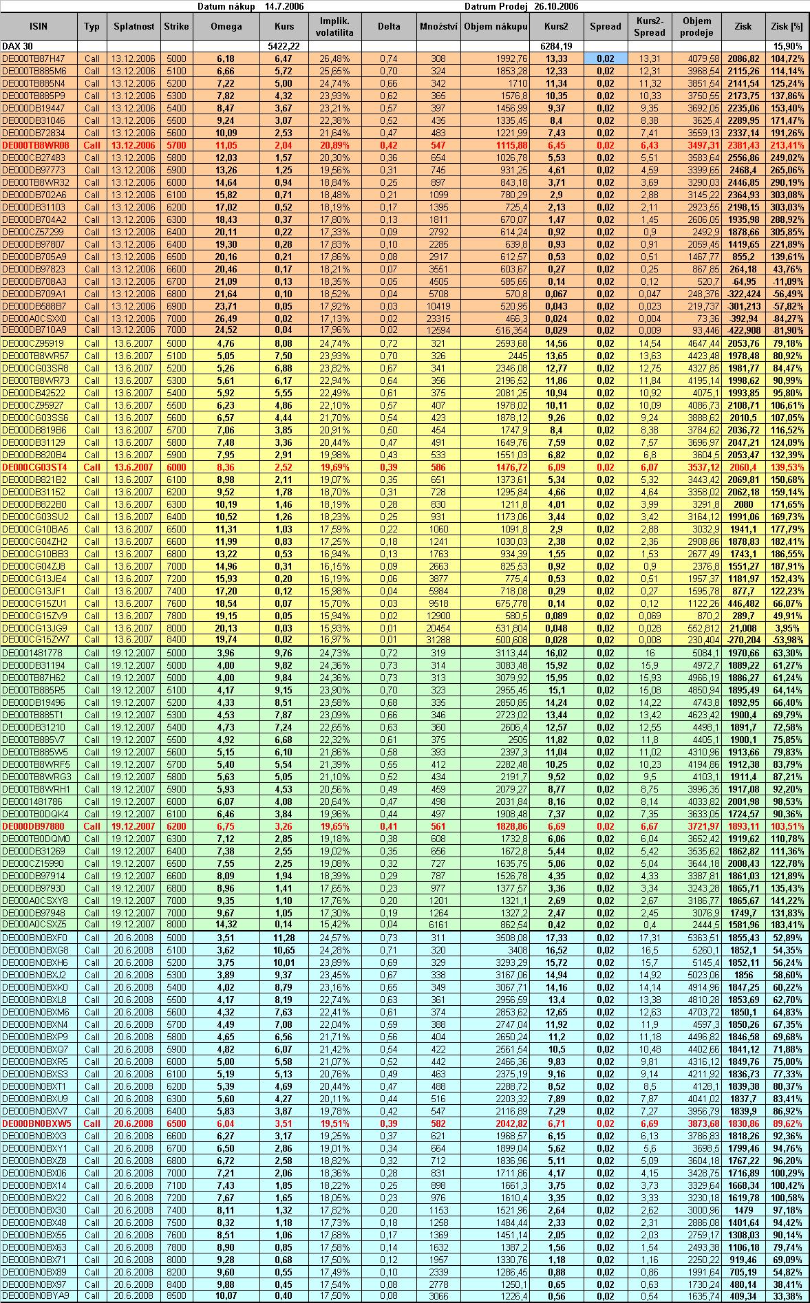 V předchozích 2 analýzách jsem si vybral obchodování trhu DAX 30 pomocí Call i Put warrantů cca v měsíčním hozizontu, nyní bych se chtěl zaměřit na obchodování delšího pohybu trhu. Opět jsem si vybral německý index DAX 30, a to období 14.7.2006 - 26.10.2006, tj. cca 3,5 měsíce. Pro tento růstový pohyb jsem zvolil Call warranty se splatností 13.12.2006, 13.6.2007, 19.12.2007 a 20.6.2008, a to v širokém rozpětí hodnot Strike. Warranty s hodnotou Delta cca 0,4 jsou v tabulkách opět vyznačeny červeným tučným písmem, v grafech zelenou barvou sloupce. Vstupní údaje pro simulovaný obchod: Datum nákupu 14.7.006 - DAX 30=5422 bodů Datum prodeje 26.10.2006 - DAX 30=6284 bodů (zisk +15,9%) Historická roční volatilita DAX 30 = 16% Vstupní hodnota účtu 5.000 EUR Risk: 2,5% hodnoty účtu bez brokerských poplatků 1. tabulka (Tabulka 1.jpg) zobrazuje simulované obchody s Call warranty 2. tabulka (Tabulka-parametry 140706.jpg) zobrazuje parametry warrantů ke dni 14.7.2006