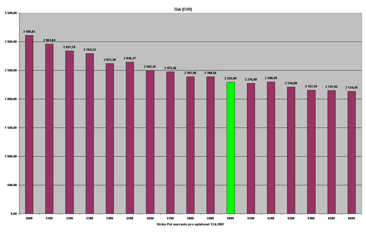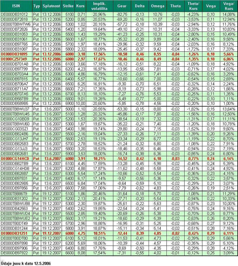 Dnes bych pokračoval, jak by vypadala situace za výrazného pohybu trhu. Nejdříve bych si dovolil upozornit na nepřesnosti v předcházejících a následujících tabulkách a grafech. Kurzy, které používám, jsou závěrečné kurzy daného dne při kterých byl proveden poslední obchod. Proto na některých datech může být vidět nepřiměřeně nízký nabo vysoký zisk, který je způsobem získanými údaji z brokerjet. Od té doby co brokerjet implementoval novou obchodní aplikaci a nelze provádět export dat, získávám data z onvista.de,ale již poslední kotované kurzy daného dne. V předcházejích a následujících simulacích jsou ale použity data z brokerjet. Pro ukázku jsem si vybral květnovou korekci opět na indexu DAX 30 při pouřití Put warrantů. Vstupní údaje pro simulovaný obchod: Datum nákupu 12.5.2006 - DAX 30=5916 bodů Datum prodeje 13.6.2006 - DAX 30=5292 bodů (ztráta -10,55%) Historická roční volatilita DAX 30 = 15% Vstupní hodnota účtu 5.000 EUR Risk: 2,5% hodnoty účtu bez brokerských poplatků 1. tabulka (Tabulka) zobrazuje simulované obchody Put warrantů se splatností 13.12.2006, 13.6.2007 a 19.12.2007. 2. tabulka (Tabulka 2) zobrazuje detailní přehled parametrů těchto warrantů k 12.5.2006 (při nákupu) Při použití "agresivnějších" warrantů na trhu, který provedl výrazný pohyb je rozdíl v absolutní hodnotě zisku výraznější než v předcházejícím příkladu, tzn. použití "agresivnějších" warrantů při výrazném pohybu trhu je výhodnější než použití "konzervativnějších" warrantů.