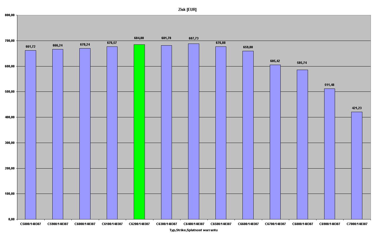 Pokračování č.2 Jak patrné z předchozího příspěvku, absolutní hodnota zisku (a to je to hlavní o co by nám mělo jít) se v širokém rozpětí Strike pohybuje v úzkém rozpětí (cca 10%). Pokud si ale zvolíme příliš "Agresivní" warrant, absolutní hodnota zisku prudce klesá. Příliš konzervativní warrant také není nejvhodnější volba, protože prudce roste potřeba vstupního kapitálu. [bold]Warranty se splatností 14.3.2007 [/bold]