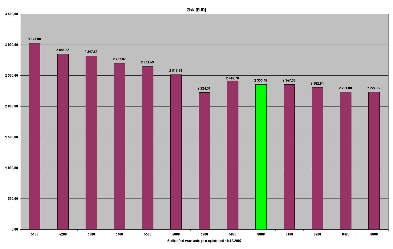 [bold] Put warranty se splatností 19.12.2007[/bold] Zajímavostí je, že i když jsem použil warranty s rozpětím splatnosti 1 rok, pokud jsem vybíral hodnotu Strike warrantu dle hodnoty delta=cca 0,4, pro každou splatnost byla hodnota strike shodná (nebo by se pouze mírně odlišovala-např. kdybych měl data k Put warrantu 5900/13.12.2006 vybral bych si asi tento warrant).