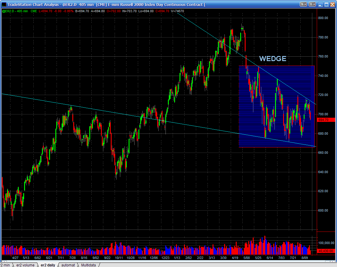 Honzo, skvělá práce, díky za její zveřejnění. Co mě na těch grafech zarazilo, je převaha longů (pohyby long/short v závislosti na dni v týdnu), obzvlášť v období 06 - 08 tohoto roku, které bychom mohli charakterizovat spíš jako konsolidaci v downtrendu než jako růstové období :) Mohu se zeptat, jakým způsobem počítáš longy/shorty? Bereš to na základě denních OHLC hodnot, tj. pokud den skončí v plusu, jde o longy a naopak? Jinak co se týče range, tak skutečně pozoruji občas dříve nevídané pohyby, což spolu s objemy svědčí o výrazném růstu obliby ER2 mezi tradery. Ještě před rokem když jsem zahlédl 100 kontraktového aska nebo bida, tak jsem si to ukládal jako screenshot, aby mi to někdo vůbec uvěřil, dneska na ERku lítaj občas stovky jako housky na krámě a není to tak dávno, co jsem sledoval jednoho pětistovkaře, jak má jeden stop za druhým (to bylo těsně před pádem ze 780 hladiny). Byl docela čitelnej a trejdil pomocí market orderů, takže měl slip kolem 1 bodu :) Dneska i pětistovka udělá kolem 0.5 bodu podle momentální hloubky trhu. Ještě co se týče charakteru pohybů ERka, dochází i k jiné změně - dříve jsem pro delší swingy v pohodě používal 30 min graf, dneska už je téměř na nic, vypadá jak seismograf po zemětřesení a pěkný signál abys hledal lupou. Mnohem čitelnější jsou tickové a volume (share) grafy. Trh se prostě mění tak jak se mění i investoři, kteří zde operují. Doplácejí na to hlavně automatické strategie, které byly naprogramovány na charakter ERka, který se od té doby hodně změnil. Hodně štěstí v obchodování, taky Honza ;) A hele mám na disku ještě aktuální daily graf erka, tak šup sem s ním...