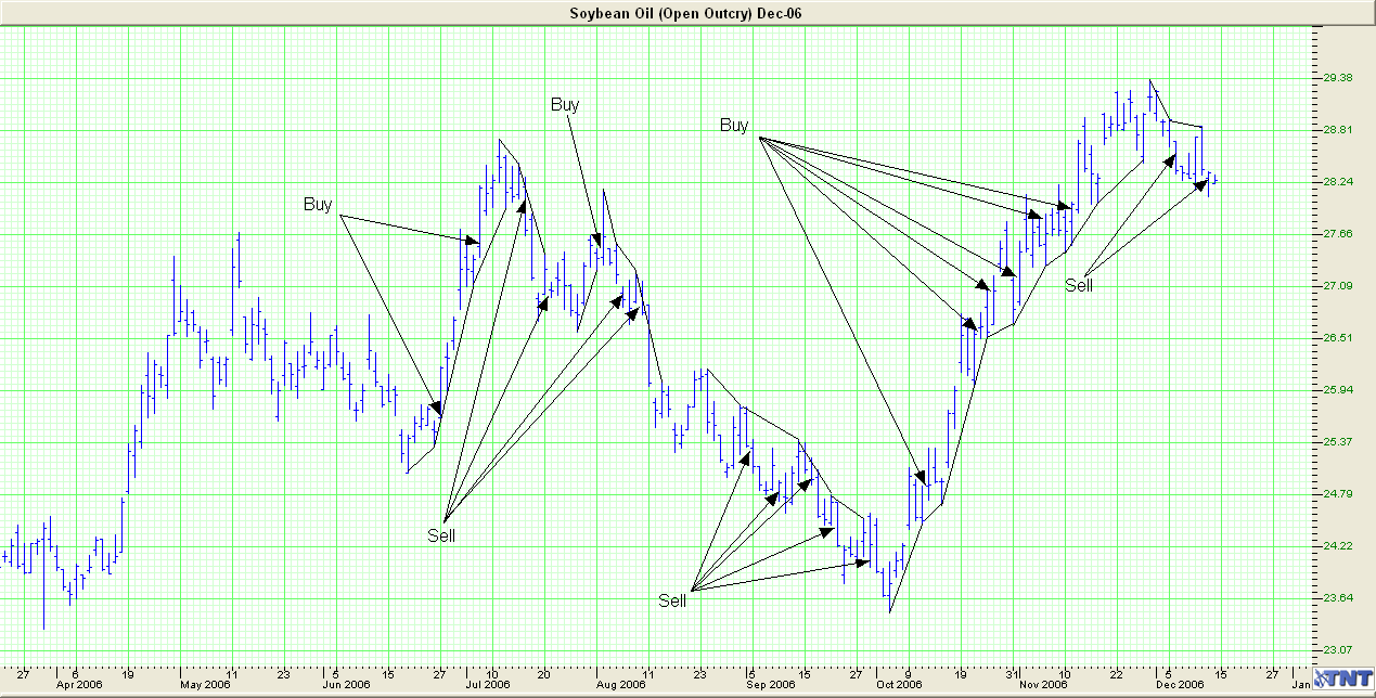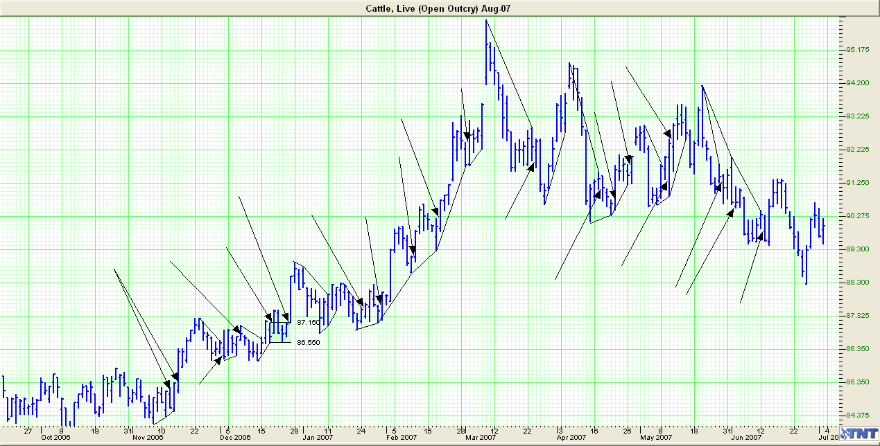 základní princip této metody je velice jednoduchý - spojují se korekční body a tím se získá trendline. V případě uptrendu se zadává nákupní příkaz 1 tick nad korekčním bodem, který jsme spojili s předchozí korekcí. Ted se pokusím popsat alespon z části obrázek: