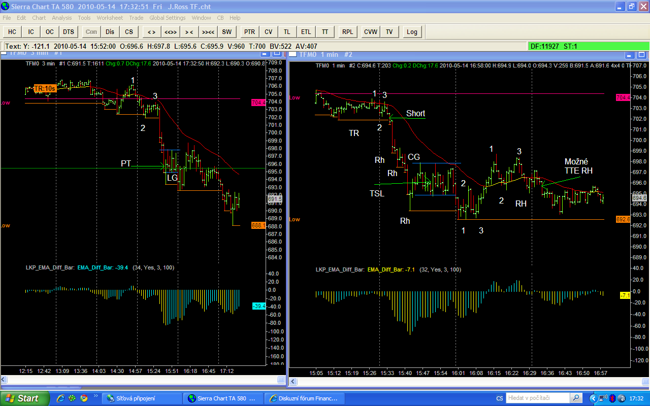 Dobrý den ve spolek, Chtěl jsem původně testovat 123, ale při testu jsem zjistil, že bych měl zvolnit, necítím se při 123 dobře a ani JR ještě moc neumím vidět a obchodovat. Proto zkusím nezávisle (bez testu) sledovat grafy a zakreslovat do nich jak jsem je viděl a při tom sledovat jak je viděli ostatní. Omlouvám se za zpoždění, ale dostávám data s dvanácti hodinovým slipage. Před otevřením trhu se vytvořilo TR v něm 123, přičemž bod 2 je falešné proražení TR. Proražení TR nebo 123 mohl být krásný obchod. Trh poté klesal až vytvořil CG, (možná LG) po proražení tohoto CG vytvořil ihned další CG. První CG bych nejspíše zobchodoval (neúspěšně) to druhé už ne. Tyto dvě CG se proměnily v TR. Průraz tohoto TR se dal také úspěšně zobchodovat, hned pod TR se vytvořilo CG jehož průraz bych také zobchodoval. Komentář nebude nutný, protože jsem již viděl jak to vykouzlil Jim36, ale pokud můžete přeci jen něco poradit, budu rád. PS: Jsem velmi rád, že se mohu zůčastnit tohoto skvělého vlákna. Tomáš