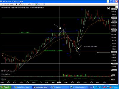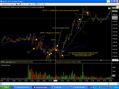 Predem velke dik vsem dikutujicum, cerpam z toho mnoho informaci. Vcera jsme jsem nevzal dva obchody, ktere byly ve vysledku nejuspesnejsi, chtel bych se zeptat na vas nazor. Obchody, ktere jsem vzal jsou oznacene zlute, ktere ne modre. 1. obchod: Na tf 3min. formace 123, ktera byla podporena mini123 na tf. 1 min. Vse bylo jako TTE formace TR nebo vrcholu 2. Navic na tf. 3 min. jde videt trend line, kde ceny nebyly schopne se vratit nad tuto uroven 2. obchod: po TaG na 123 tf. 1min. a to vse v ranci trendu (down). Tento obchod jsem nebral, protoze na tf3 min. jsem zadnou formaci nevidel. Je to spravne rozhodnuti, kdyz jsem do trhu nevstoupil? Ja jsem v tom vstupu take hlavne videl druhe prorazeni TR, to me lakalo do vstupu. Pak me ve vysledku napadlo, jestli jako druhe prorazeni TR na tf3min. a 123 na tf1min. (ikdyz neni na tf. 3 min.) neni dostacujici signal pro vstup. 3. obchod: na 123 tf1 min. a take dle meho nazoru jde videt na tf3, min., cena byla daleko od EMA proto jsem vstoupil do long. Normalne bych asi nevstupoval proti trendu, ale zde byla silna R/S uroven - dnesni open a low predchoziho dne a navic jsem predpokladal korekci na tf3. min a vznik velkeho 123 (cervene oznceno), proto jsem predpokladal dlouhou pozici, avsak jsem byl vyhozeny na low crky. Vim, ze tento stop loss byl zbytecne tesny, ale bal jsem se odrazu od EMA zpet do shortu. 4. obchod: vstup do short na TR na tf. 1.min.Duvod: ceny, kdyby meli zajem jit nahoru, uz by tam byly. Proto vsup do short, posouvani stop loss po H/L carkach me taktak udrzelo. Vzhledem k tomu, ze ceny prudce neklesy (predpokladal jsem zpet pod trend line, ktera je znazornena natf3.min.), tak na reverzni carce jsem vystoupil, navic tam byla jiz zminena R/S uroven. 5. obchod. Jak jsem jiz rikal, prudky pohyb do long jsem ocekaval, ale nenasel jsem si vstupni bod. Stejne jako u obchodu 2. jsem videl 123 na tf. 1 min., ale na tf 3.min. jsem nic nevidel, proto jsem na 123na tf. 1min. nevstoupil -jaka skoda... Dle meho nazoru jako DB na silne S/R urovni po plus minus 50% procentech pohybu od high (vrhol cerveny 2) jsem mel vstoupit 6. obchod:jako TTE RH ve spekulaci na prorazeni High predchoziho dne. Podle me nebezpecny obchod, proto jsem volil 1target na 3 tick a stop hned pod low prorazeci usecky a cekal jsem a vyplatilo se Rad bych prijal jakykoliv komentar, predevsim k obchodu 2 a 5.