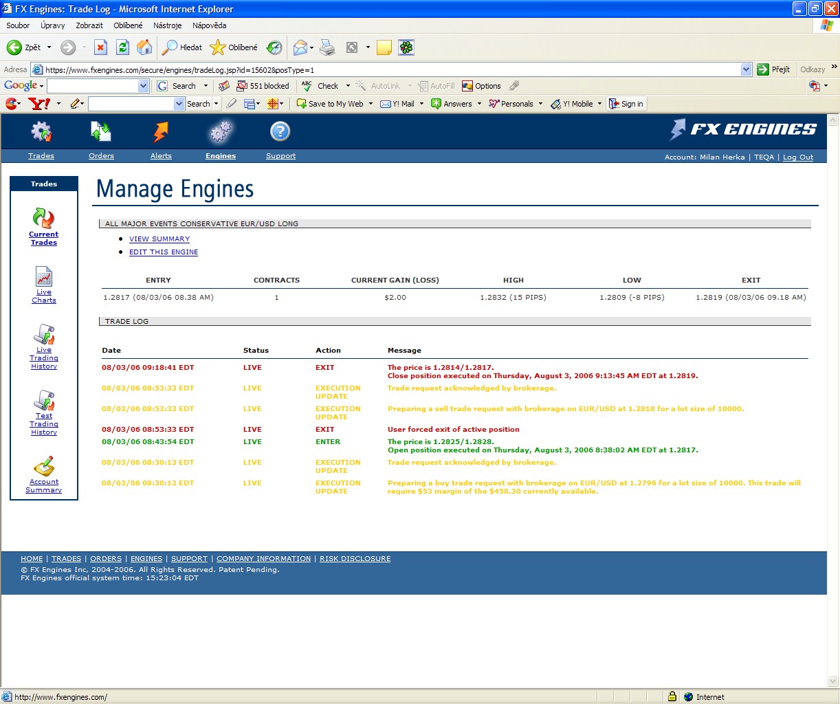 Měl jsem tam automat, ale zapomněl jsem v Money Manageru označit počet současně obchodovaných lotů (měl jsem tam 1). Vzalo mě to tedy 1 pozici a to konzervativní styl. Zisk byl pouhých 2$. Měli prý problémy u FXCM. Později sem dám log. Vypádá to že FXCM nestíhalo. Uvidíme zítra.