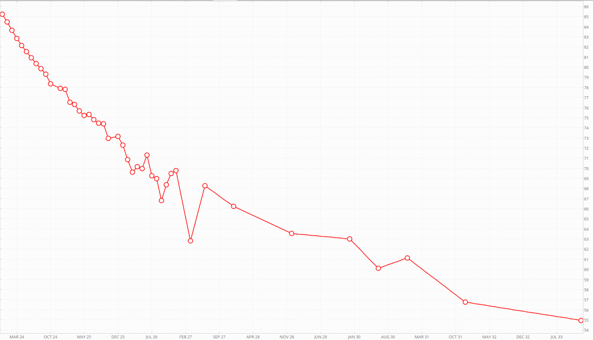 Takto vypadá forward křivka jednotlivých futures kontraktů ropy (říjen 2023):