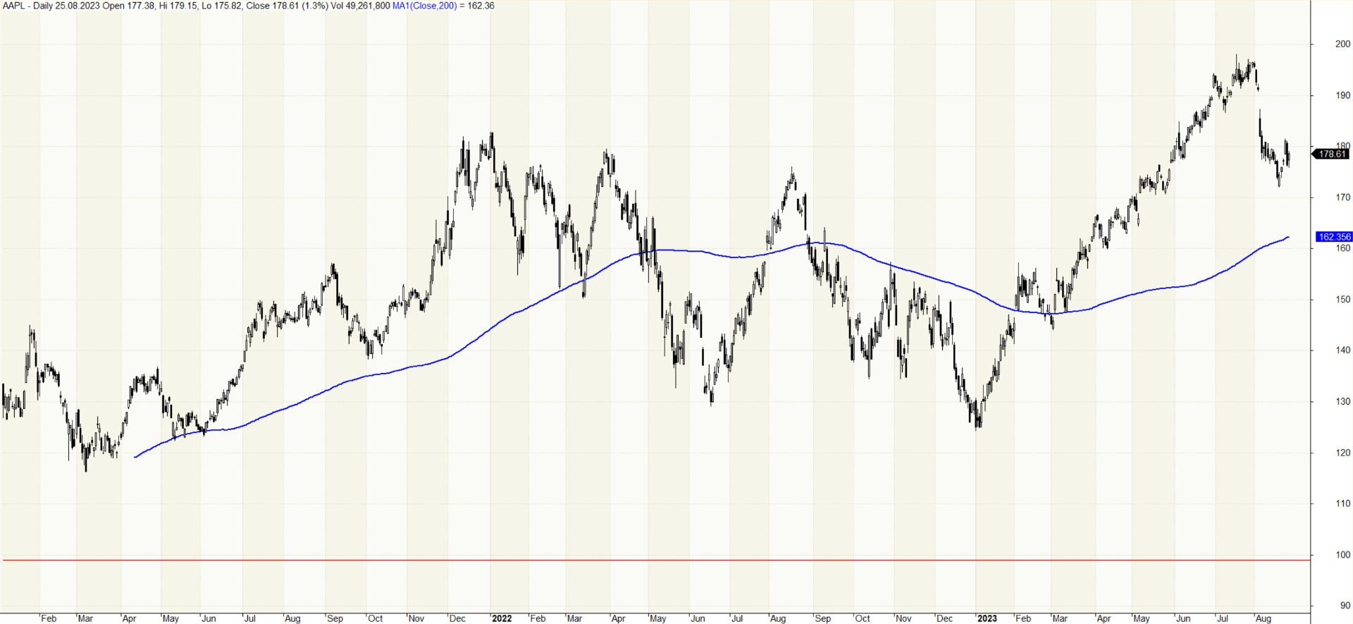 Ukázka cenového grafu akcie AAPL (Apple) a jednoduchého klouzavého průměru s periodou 200: