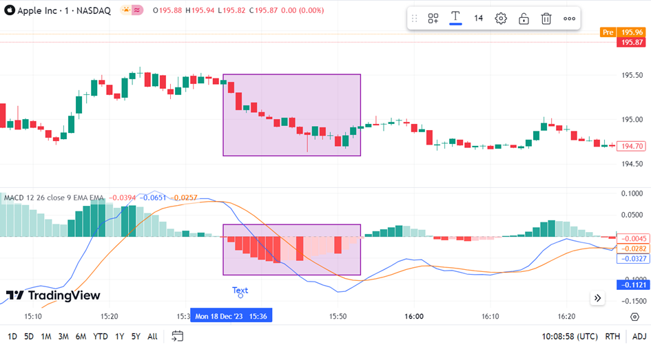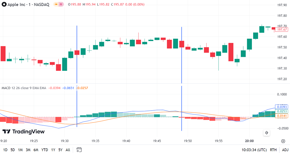 V grafu akcie Apple nám MACD indikátor identifikoval dvě nákupní příležitosti. U první se jedná o nákupní příležitost, kdy modrá MACD linie kříží zdola nahoru signální linii a obě se nachází pod histogramem. V druhém případě jsou obě linie nad histogramem a MACD linie kříží signální shora dolů, tj. jedná se o signál k prodeji.