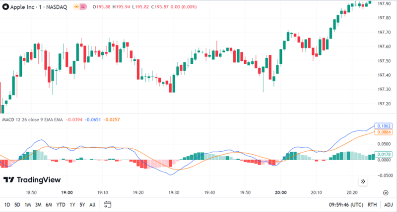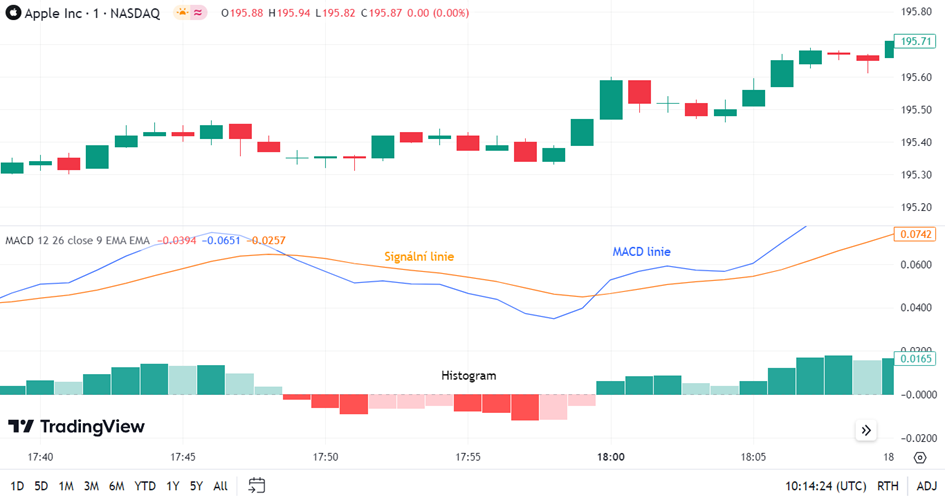 MACD indikátor aplikovaný na graf akcie Apple. Modrá čára značí MACD linii, oranžová čára signální linii a pod nimi se nachází histogram.