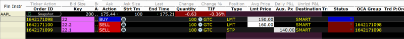 Screenshot zobrazuje typické využití OCO vazby v platformě TWS brokerské společnosti Interactive Brokers. Vidíme primární limitní nákupní příkaz na nákup 100 shares APPL za cenu 150. Pokud bude tento příkaz vyplněn (cena musí k příkazu doklesat, nyní se na screenshotu obchoduje za cenu 175,21) budou do trhu poslány prodejní příkazy. Stop-loss na ceně 140 (pozice bude ukončena ve ztrátě) a profit target na ceně 160 (pozice bude ukončena v zisku). Mezi těmito dvěma příkazy je definovaná OCO vazba - vidíme stejné číslo ve sloupci OCA Group. V praxi to znamená, že když bude jeden příkaz vyplněn (např. výstup na profit targetu), druhý příkaz bude zrušen (v tomto případě stop příkaz).