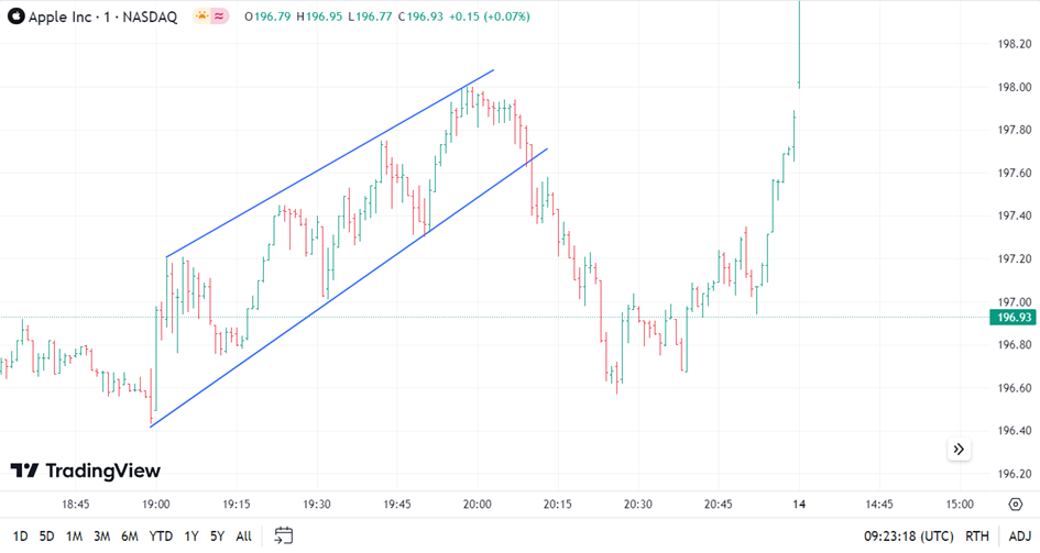 Graf akcie Apple s vyznačeným cenovým patternem Rising Wedge, trh se pohybuje v rostoucích trendových čarách, které se sbíhají, a naznačuje pokračující trend. Proražení dolní trendové čáry trhem směrem dolů naznačuje změnu trendu.