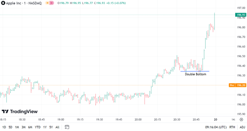 Graf akcie Apple s vyznačeným cenovým patternem Double Bottom, trh dvakrát otestoval cenovou hladinu 196,35 USD, aby se následně odrazil opačný směrem a pokračoval v býčím trendu.