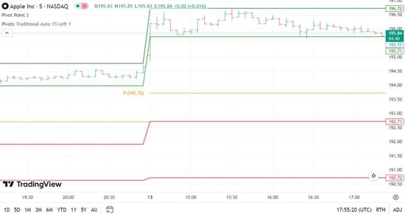 Indikátor Pivot Points aplikovaný na graf akcie Apple. Pivot znázorňuje oranžová linka, červené linky značí dvě hladiny supportu a zelené linky dvě hladiny rezistence.
