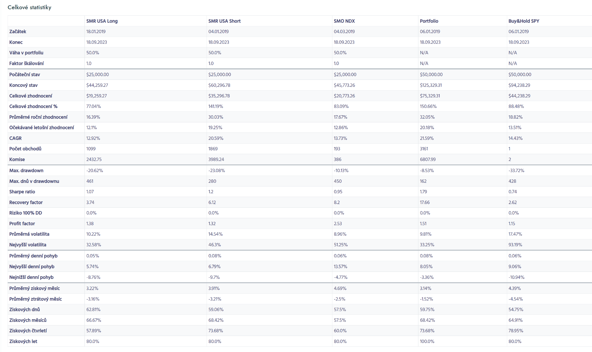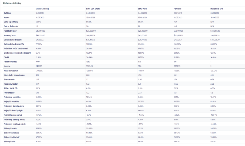 V níže uvedené tabulce je vidět, že jednotlivé strategie mají ve sledovaném období posledních let průměrné roční zhodnocení v pásmu 16–30 %. Jejich drawdowny jsou od 10–23 %. Pokud strategie spojíme dohromady, pak získáme průměrné roční zhodnocení 32 % při drawdownu 8,53 % (souhrnná statistika je ve sloupci portfolio). Tedy vyděláme více, při nižším risku. To je v principu důvod, proč obchodovat na účtu více strategií v portfoliu a nevkládat veškerý risk a úsilí do jediné strategie.