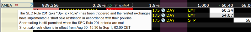 Short je možný, ale pouze nad aktuální cenou (trh musí nejprve alespoň o tick povyrůst). Obchodníci, kteří drží pozice tak mají šanci své pozice uzavřít.