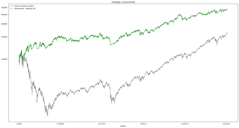 Screenshot znázorňuje srovnání výkonnosti popisovaného hypotetického obchodního systému založeného na indikátoru RSI (zelená linka) ve srovnání s benchmarkem, v tomto případě Nasdaq 100. Na grafu vidíme, že takto jednoduchý systém výrazně překonává benchmark. Tento konkrétní příklad je ilustrativní a demonstruje principy, které na Finančníkovi aplikujeme při tvorbě obchodních strategií. Podobnou strategii bychom spíše obchodovali na akciových indexech. Vytvořené strategie navíc kombinujeme do diverzifikovaného portfolia, abychom využili různé tržní situace a snížili riziko.