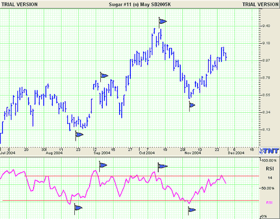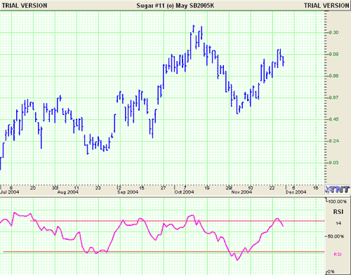 Indikátor se zobrazuje coby oscilátor pod samotný cenový graf. Zde je zobrazen graf komoditního kontraktu cukru spolu s indikátorem RSI: