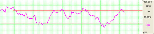 Pokud si necháme zobrazit indikátor jakožto doplněk k některému z komoditních grafů, v první řadě si zřejmě všimneme, že je RSI indikátor „ohraničen“ hodnotami 0 % a 100 %, v polovině pak můžeme vidět i úroveň 50 %.