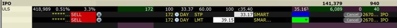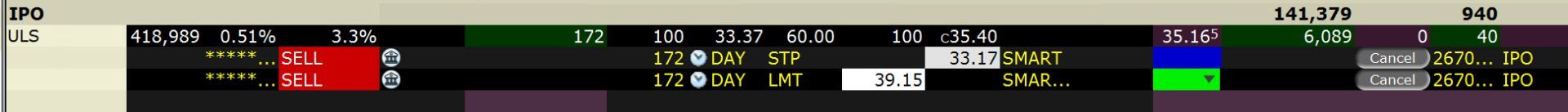 Na screenshotu je vidět, že máme nakoupeno 172 akcií společnosti ULS. Jde o otevřenou pozici v rámci strategie IPO, jejíž popis si můžete přečíst v článku Mechanické obchodování IPO (Initial Public Offering). Akcie se v době pořízení screenshotu obchodovala kolem ceny 35,40.